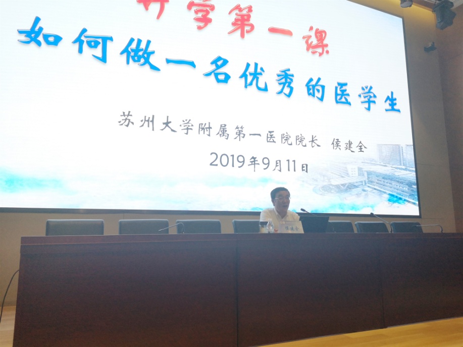 9月11日,苏州大学附一院在总院综合楼学术报告厅举办2019级新生“开学第一课”入学教育活动。校党委常委、副校长、院党委书记陈卫昌,院党委副书记、院长侯建全分别为204名2019级临床医学、口腔医学及医学影像专业同学授课。活动由第一临床医学院副院长胡春洪主持,临床教学办公室、各专业负责人、教学骨干参加活动。