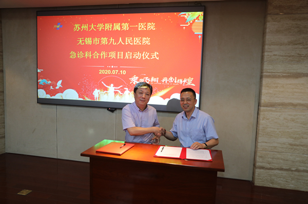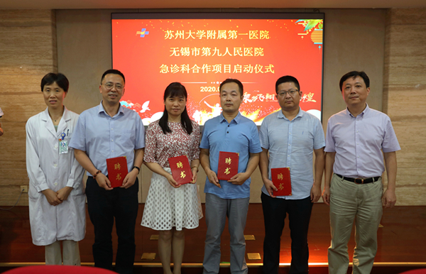 7月10日下午1:30,苏大附属无锡九院与苏州大学附属第一医院急诊科合作项目启动仪式在学术报告厅如期举行。苏大附一院徐峰主任等四位专家,附属无锡九院副院长、创伤救治中心主任薛明宇,党委副书记郭亚萍,相关职能科室负责人以及急诊科、创伤中心、胸痛中心、卒中中心医护们共同参会。该项目的顺利启动标志着两院学科合作常态化开展,旨在为区域患者提供高效、便捷、最佳诊疗路径及方案,最大程度挽救生命。