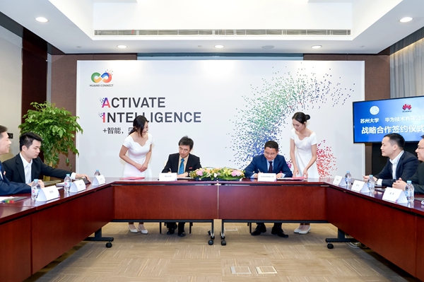 10月10日,苏州大学与华为技术有限公司战略合作框架协议签约仪式在上海世博中心举行。双方本着“联合、互补、共赢、发展”的原则,面向信息技术和高等教育发展未来,共同致力于打造一个镜像化、数字化、智能化的“云中大学”,并在人才培养、科研合作、成果转化等领域开展全面合作。