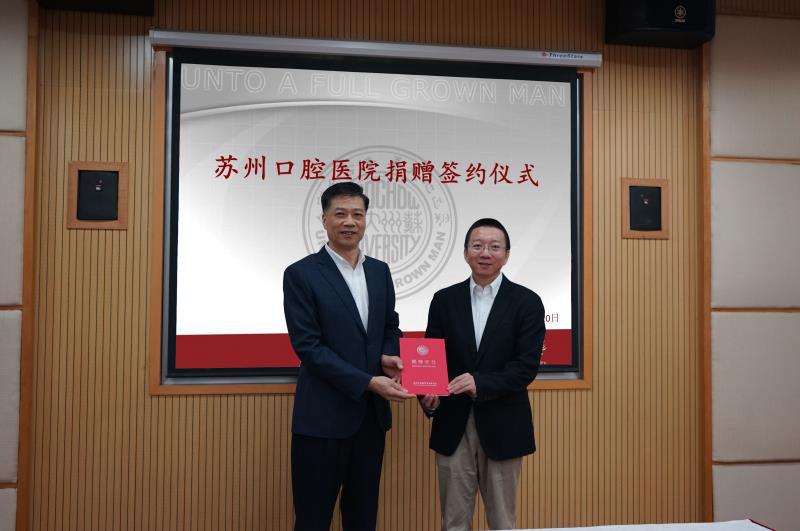谈永暐董事长和胡新华主任分别代表附属口腔医院和苏州大学教育发展基金会签订捐赠协议。杨一心副校长向谈永暐董事长颁发了捐赠证书。