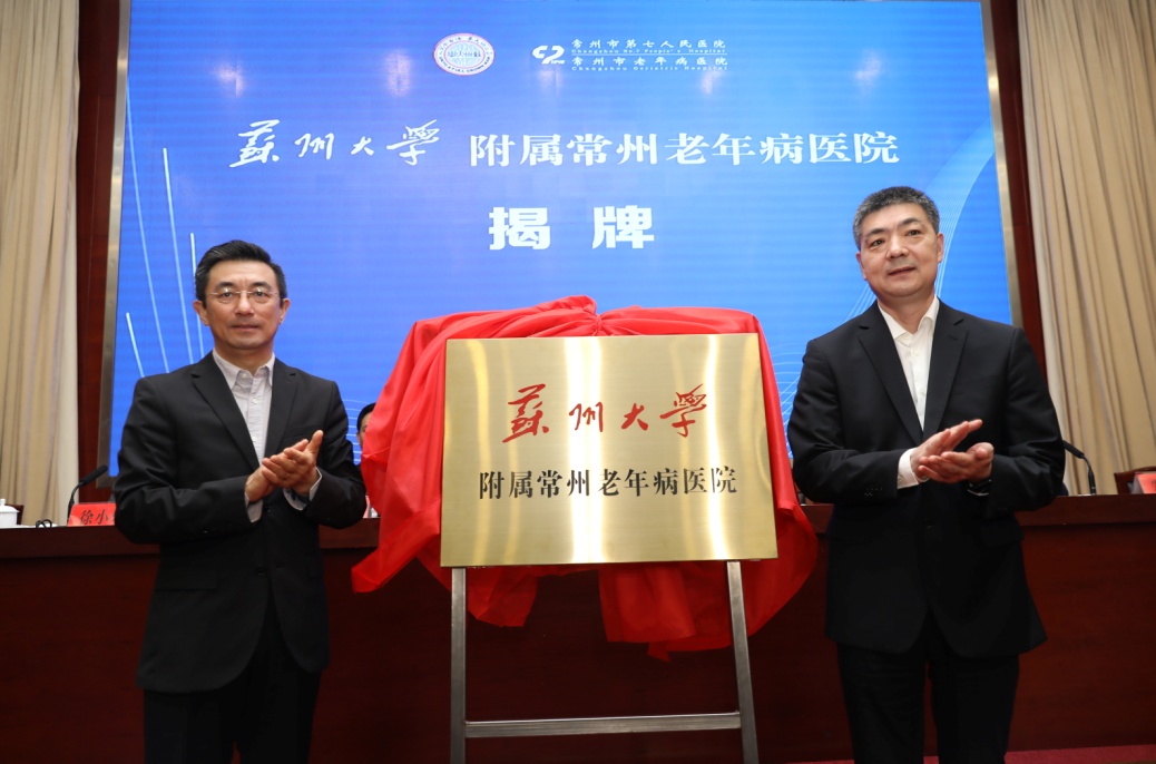 熊思东校长与陈正春副市长共同为苏州大学附属常州老年病医院揭牌。