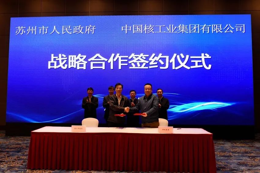 11月3日,中核集团与苏州市政府签订战略合作协议。江苏省委常委、苏州市委书记许昆林,苏州市委副书记、市长李亚平会见了国防科工局副局长、国家核事故应急办主任张建华和中核集团总经理、党组副书记顾军一行,并共同见证签约。