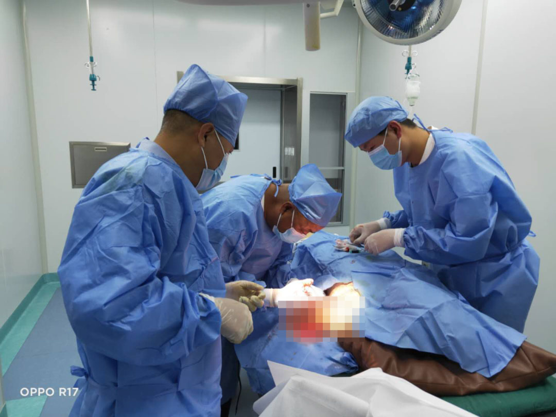 一名患者工作时不慎将自己的左上臂搅入大型捆草机中,因左上肢离断来急诊科就诊,值班医生赵博立即进行深静脉穿刺,给予止血、补液、抗休克治疗,与家属沟通后当机立断将患者推入急诊手术室进行左上臂断臂残端修复术,刘瑞主任立即组织手术人员,有着骨科丰富经验的菅国明医生和刘伟医生,护士孙洪皓,止血、残端修复,历时一个半小时,手术很顺利,患者在急诊住院数天,好转出院。