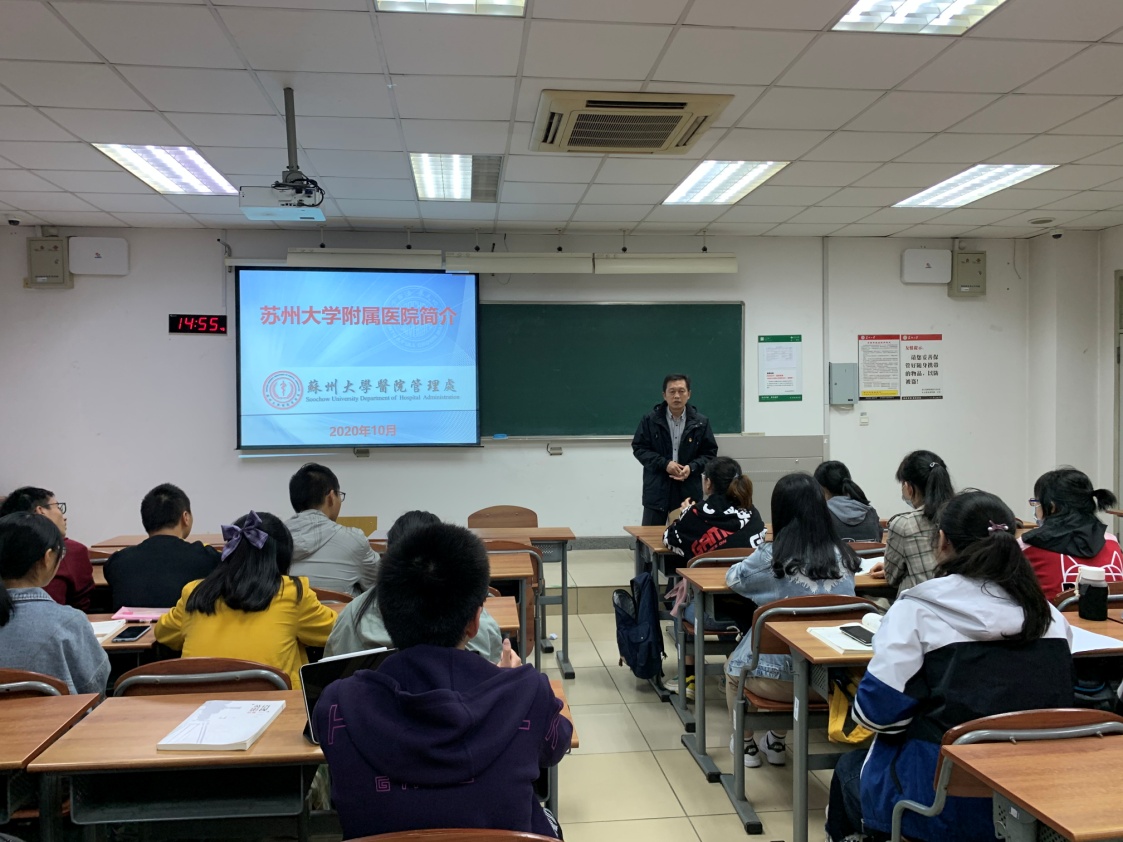 10月28日下午,医院管理处党支部与医学部2019级临床医学5+3一体化4班团支部的党团共建启动仪式在独墅湖校区顺利举行,双方支部全体成员参加。医院管理处蒋敬老师首先向学生们介绍了苏州大学医院管理处的职能及苏州大学附属医院的基本情况,之后为学生做了《关于“5+3”一体化医学生职业生涯规划》的讲座。蒋老师从“5+3”一体化教育的培养特色入手,重点阐述了如何做好自我定位、如何面对学业现实、为什么要做科研等问题,对在座的医学生提出了全面的意见与建议。讲座后,蒋老师与同学们进行了深入交流,同学们纷纷表示受益匪浅,将认真思考未来的职业定位。