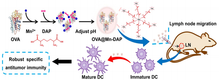 基于上述思路,汪健教授和刘庄教授研究团队提出了一种创新的策略来构建基于纳米配位聚合物的纳米疫苗以进行有效的肿瘤免疫治疗。研究团队利用Mn2+离子、DAP配体(Nod1激动剂)和模式抗原OVA制备得到OVA@Mn-DAP纳米疫苗并用于肿瘤免疫治疗。该纳米疫苗可以有效促进抗原的细胞摄取、DCs成熟,增强其在淋巴结的滞留时间,并通过激活Nod1信号途径促进抗原交叉呈递。OVA@Mn-DAP不仅可以用作预防性纳米疫苗以保护小鼠免受肿瘤的攻击,而且还可以作为治疗性纳米疫苗与免疫检查点阻断型抗体α-PD-1联合治疗以抑制肿瘤的生长而延长动物的存活时间。研究工作为肿瘤疫苗的制备提供了新方法,在各种实体肿瘤的疫苗制备中具有潜在的转化前景。