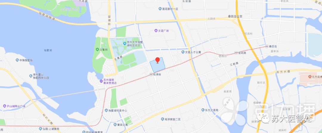 苏州大学附属独墅湖医院(苏州市独墅湖医院)坐落在苏州工业园区独墅湖科教创新区(崇文路9号),松涛街以东、创苑路以南、雪堂街以西、崇文路以北地块,四面均设出入口,与公交站台相邻,地铁2号延伸线、8号线(在建)直通医院地下连接走廊。