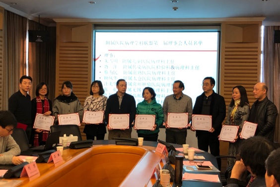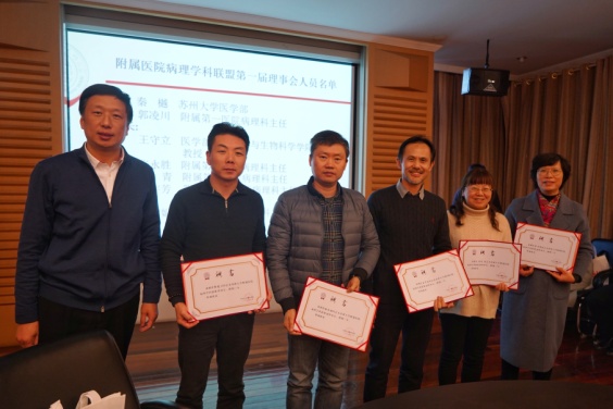 大会推荐通过了苏州大学第一届病理学科联盟理事会成员名单,聘请医学部主任秦樾担任顾问,附属第一医院病理科主任郭凌川担任理事长,医学部基础医学与生物科学学院王守立教授,附属第二医院、附属第三医院与附属张家港医院病理科主任张永胜、李青、韦宇芳四人为副理事长,其它9家附属医院病理科负责人为理事。陈卫昌副校长、徐小乐处长、医学部党工委邹学海书记、医学部基础医学与生物科学学院沈学伍书记、郭凌川理事长分别给学科联盟理事长、理事单位颁发证书并授牌。