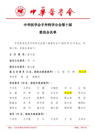 2025年12月27日,中华医学会手外科学分会全体委员换届选举会议顺利召开。选举中,苏州大学附属无锡九院党委书记、骨科主任芮永军当选中华医学会手外科学分会第十届委员会副主任委员,这已是他第五次当选。同时,苏州大学附属无锡九院党委副书记、院长、骨科副主任糜菁熠当选为该分会委员。