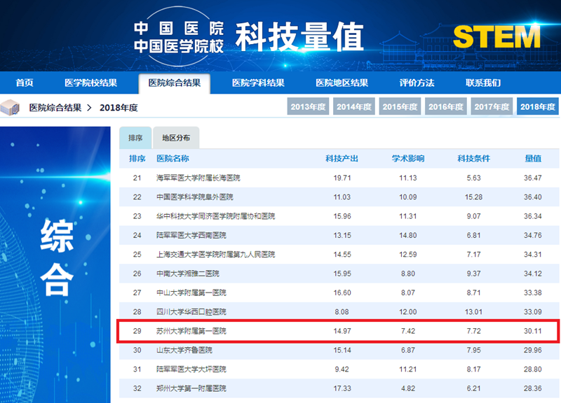 2019年12月19日,由中国医学科学院主办的2018年度中国医院科技量值与2018年度中国医学院校科技量值(STEM)发布会在中国医学科学院礼堂举行。2018年度中国医院科技量值(STEM)覆盖全国1660家医院,此次发布综合和29个学科前100位医院排名。其中,四川大学华西医院、中国人民解放军总医院、中国医学科学院北京协和医院名列综合排名前3位,在本年度排行榜上,苏州大学附属第一医院表现亮眼,排名升至第29位,比去年的排名上升1名,省内排名第2位,其他附属院也取得较佳成绩。