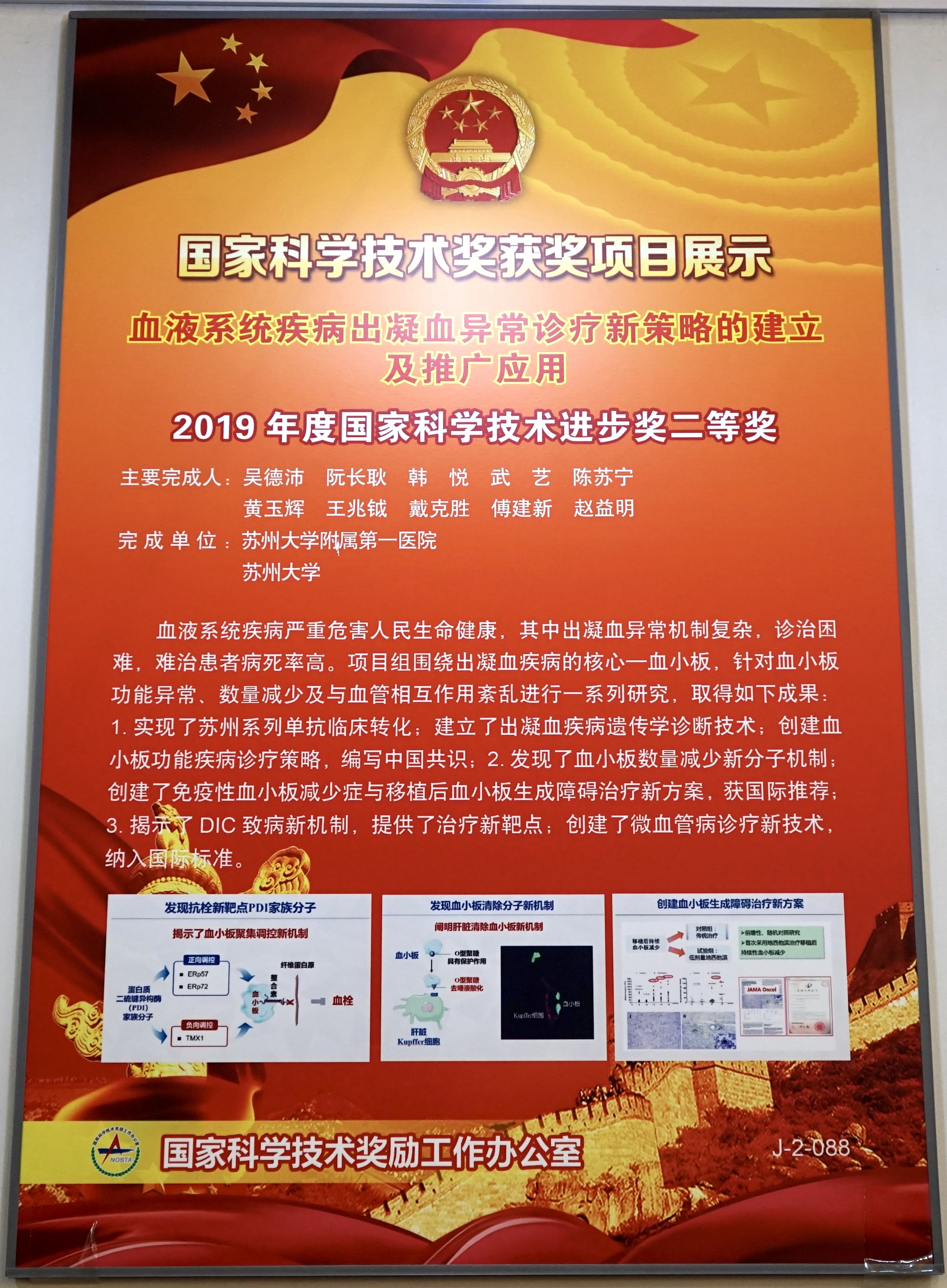 2020年1月10日,2019年度国家科学技术奖励大会在北京人民大会堂举行,习近平总书记出席大会。由苏州大学附属第一医院血液科与苏州大学完成的《血液系统疾病出凝血异常诊疗新策略的建立及推广应用》荣获国家科技进步二等奖,这是医院四年内三次获得该荣誉,也是血液学科继2016年获得国家科技进步奖之后再获殊荣。苏州大学附属第一医院血液科主任、中华医学会血液学分会主任委员吴德沛,作为第一完成人,接受了颁奖。