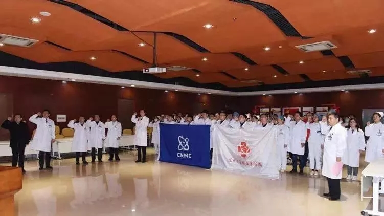 苏州大学附属第二医院(核工业总医院)医院感染管理处处长施晓松、呼吸科副主任医师周童、急诊医学科副主任医师周保纯、重症护理护师周晓晨、重症护理护士韩信、重症护理护士邓天星组成首批医疗队奔赴湖北。誓师大会上,院长徐博说:“在以习近平同志为核心的党中央坚强领导下,坚定信心、同舟共济,科学防治、精准施策,一定要坚决打赢这场疫情防控阻击战!”