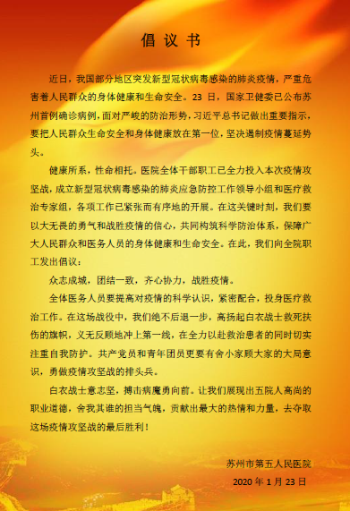 1月23日,医院向全院职工发出倡议,全院上下都严阵以待、整装待发,众志成城打好这场疫情攻坚战。“健康所系,性命相托。我院全体医务人员将众志成城,高扬白衣战士救死扶伤的旗帜,义无反顾地冲上第一线,勇做疫情攻坚战的排头兵,为百姓的健康保驾护航。”医院院长程军平说。(转自苏州日报)