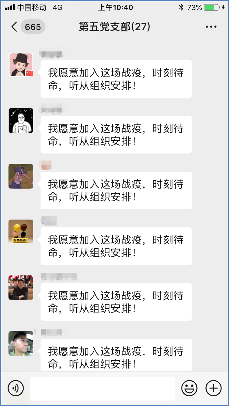 医院第四、第五党支部第一时间在党支部群中发出倡议,苏州市优秀共产党员吴敏智号召党员要有舍小家顾大家的大局意识,充分发挥党员的模范带头作用,主动投身疫情的防治工作,成为这场疫情攻坚战的排头兵;每一位党员要发挥自己的学科优势,紧密配合,全力以赴;每一位党员要有不畏艰险,勇往直前的必胜信念,奋力筑起捍卫人民健康的钢铁长城。