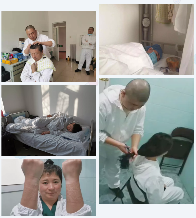 为了降低感染的几率,医疗队的男队员们把头发都剃光了,女队员们也将头发剪短。每个班次下来,医生护士前胸后背都是汗,因口罩压迫,面部是麻木的,脸上、身上多处压痕,因长时间戴防护镜,导致眼睛干涩。医护人员每次从岗位上下来,都要脱完隔离衣、淋浴消毒后才能就餐,吃饭睡觉的时间都不规律……