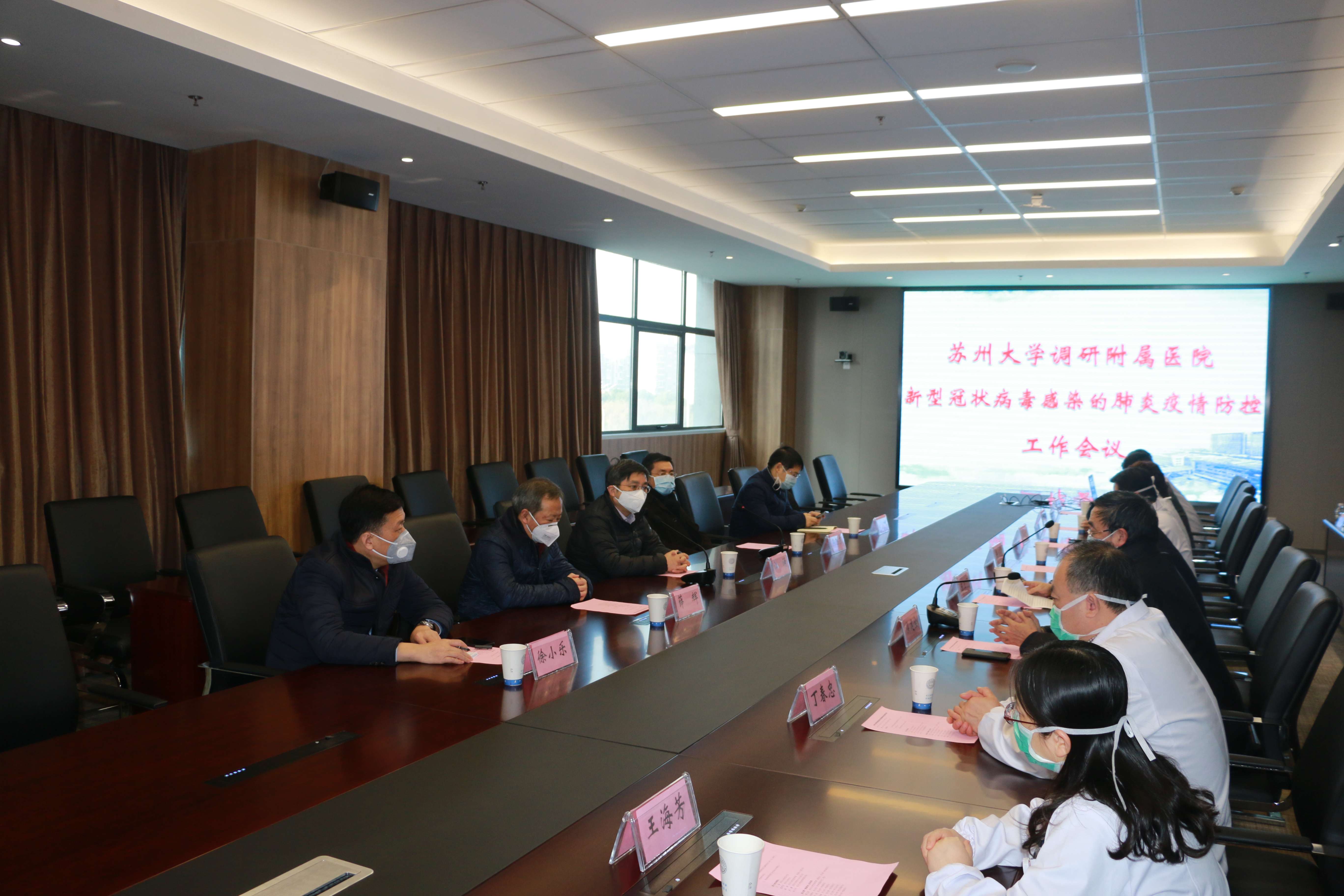 陈卫昌对医院的疫情防控及援湖北工作做了简要的汇报。在新型冠状病毒感染的肺炎疫情发生以来,医院坚决贯彻落实习近平总书记的重要指示批示精神,按照各级政府、省市卫健委和大学党委的各项部署要求,把疫情防控工作作为当前最重要的工作来抓。一是各级领导干部坚守岗位,靠前指挥,守土有责、守土担责、守土尽责,全力做好各项工作。1月19日医院党委就成立了疫情防控领导小组与专家小组,春节期间多次召开会议,分析研判、研究部署医院防控工作。医院党政主要领导始终站在疫情防控的第一线,临床医技科室、各行政职能部门积极行动,全力推进加强疫情防控的各项工作。二是加强党的领导,让党的旗帜在防控疫情阻击战一线高高飘扬。医院党委在疫情防控工作中加强党的领导,突出党员先锋意识,号召共产党员带头在疫情防控第一线,医院发出“致全院共产党员”的一封信,鼓励全院党员提高政治站位,发挥党支部战斗堡垒和党员的先锋模范作用。医院各总支发挥自身优势与特点,站在医院不同的岗位上投入疫情防控第一线,全力守护人民群众的生命安全和身体健康。在医院支援湖北及五院的11名医护人员中,7名为中共党员。三是全力做好作为定点医院的疫情防控和诊治的各项工作:医院早期预警,第一时间诊断新型冠状病毒感染的肺炎;充分发挥专家作用,科学研判、抓住可疑患者的蛛丝马迹;顺应时势,提早扩大筛查指征;合理布局,筑牢医院防控的“三道防线”;全员动员,开设两院区24小时发热门诊;全员培训,防控知识做到入脑入心;全面防控,努力保障患者和医护人员安全;多方筹措,不断补齐医疗物资缺口;早预警、早发现、早隔离、早报告和集中治疗;明确职责,把防控落实到科室和个人。四是响应号召,派出多支精干医疗队驰援湖北等地。根据省市卫健委指令,先后派出2批次共9人奔赴湖北、2名医护人员支援苏州附属传染病医院,根据国务院和国家卫健委委派,医院重症医学科郭强2次赴甘肃指导疫情防控工作。五是全力做好学生的疫情防控工作。根据学校要求,严格执行并落实医院实习生、研究生的管理工作,对寒假期间在苏研究生的健康实行日报告制度。