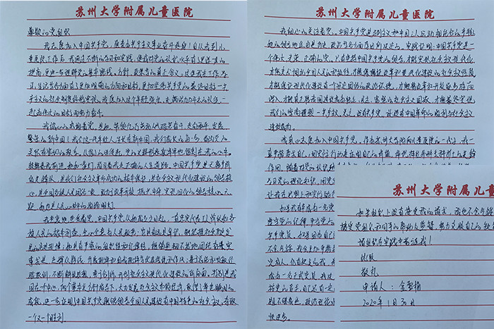 苏州大学附属儿童医院的医护人员也纷纷报名,表示愿意前往武汉,愿意去发热门诊工作,其中很多人写下:我是共产党员,我先去。医院的党员在此次疫情战役中充分发挥着先锋模范带头作用,从发热门诊排班可以看到几乎都是党员。1月30日第四党总支第二党支部副书记廖健毅收到了两份特殊的申请书,神经外科金雪梅护士、普外科病区金文宜护士长的入党申请。
