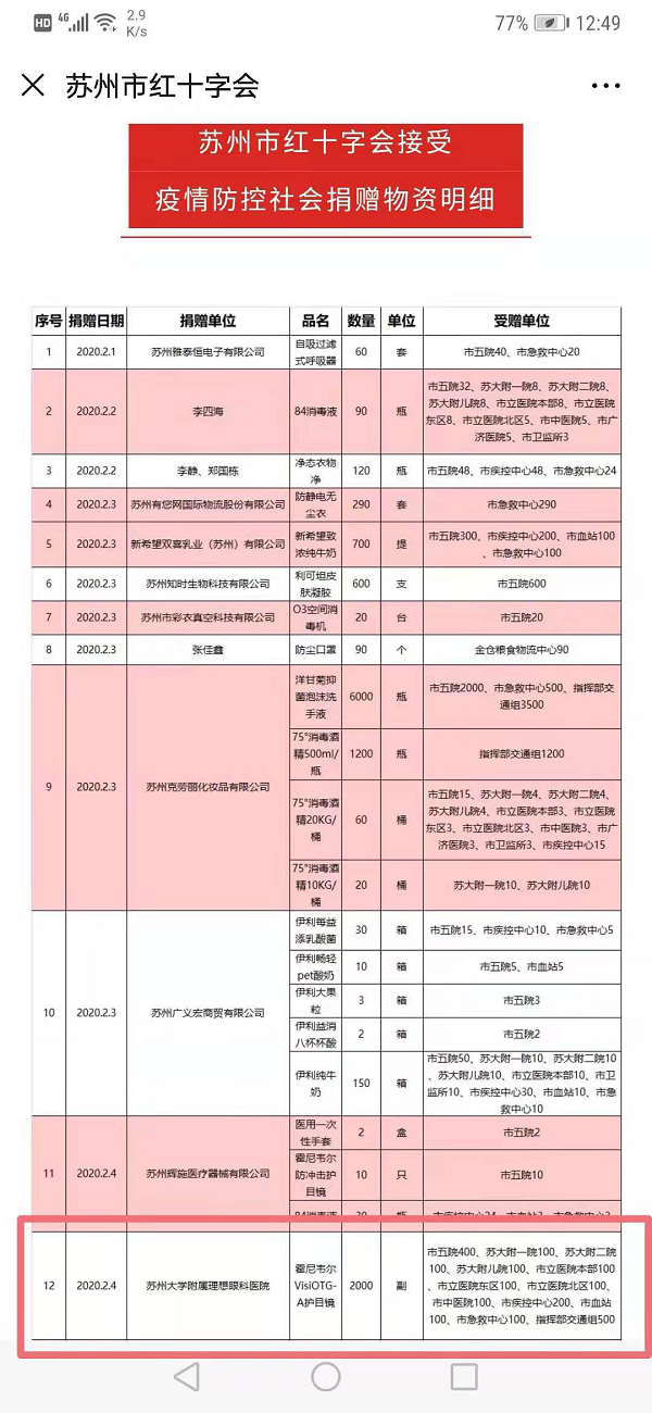 苏州市红十字会副会长张献忠表示:“非常感谢苏大理想眼科医院的捐赠,护目镜是我们当前紧缺的重要物资之一,在疫情防控的关键时刻,理想的这一善举犹如雪中送炭,起到了积极作用,为冲在一线的医务人员和工作者增加了一道有力屏障。我们将根据需求,尽快将这些物资送到前线……”。