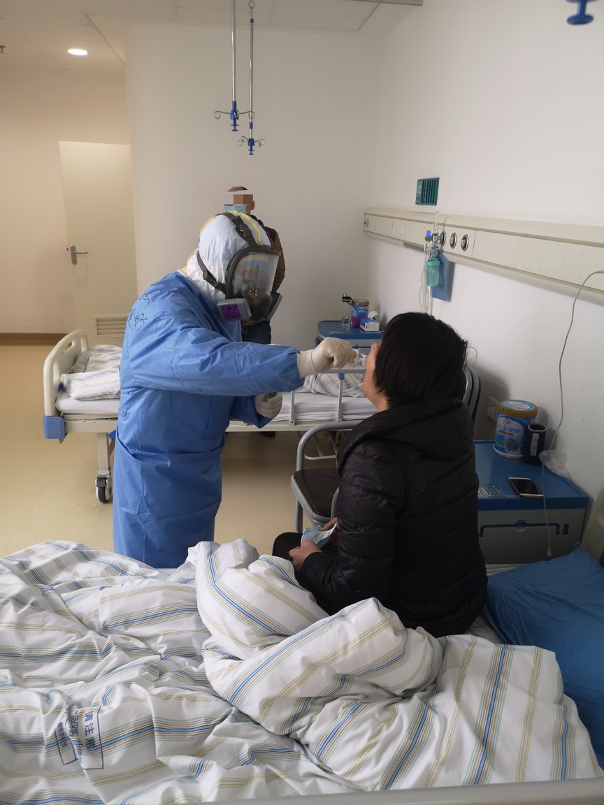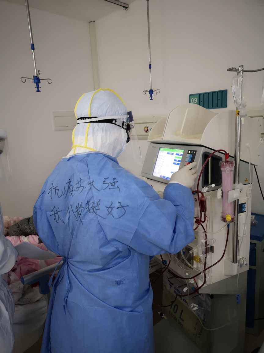 今天穿好防护服后,队友在我的隔离服写上“抗疫苏大强,我们都挺好”。感觉这句话特别好,既能反映我们是江苏医疗队的一员,也能反映我们是苏州的,是苏州大学的一员,鼓舞人心。早查房需要巡查整个病区的患者,每个患者的情况及医嘱修改都要记录下来。查到近一半患者的时候,一起的夏医生突然感觉不适,我们赶紧扶她坐下休息,她稍作休息后,便继续查房。一些患者看到我们隔离衣上的标语都很激动,甚至落泪。看到前几天置管的CRRT患者病情趋稳,感染指标下降,血小板回升,心中感到莫名的欣慰。查房结束时已是上午11点。将表格拍好照,发给在办公室的同事,处理今天的医嘱。再换上防护面罩,给疑似和确诊患者作咽拭子采样,这项工作简单但危险,不敢有丝毫懈怠,10多个患者采集完毕,已是精疲力竭。