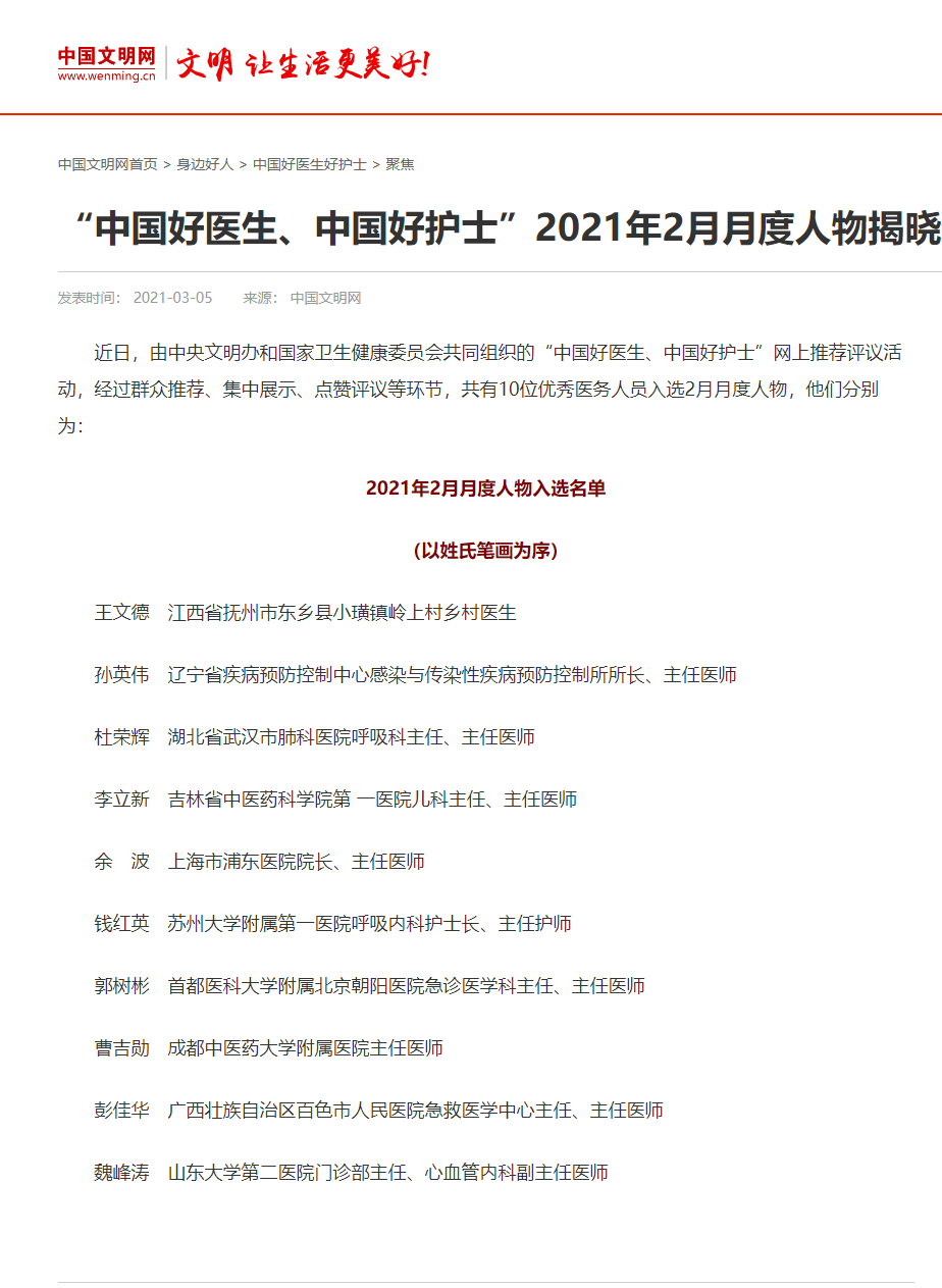 近日,由中央文明办和国家卫生健康委员会共同组织的“中国好医生、中国好护士”网上推荐评议活动,经过群众推荐、集中展示、点赞评议等环节,共有10位优秀医务人员入选2月月度人物。其中,苏州大学附属第一医院呼吸内科护士长、主任护师钱红英光荣入选。