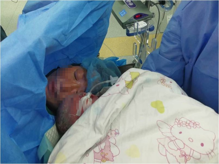 李炘主任确认新生儿情况允许,予母婴早接触后目前新生儿已转运至附属儿童医院进一步诊治。