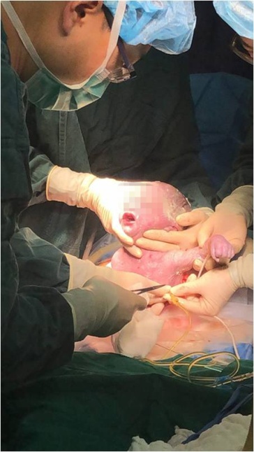 要知道,不明原因的胎儿胸腔积液,如在孕32周前,围产儿死亡率可达55%左右,孕32周后也有30%左右的围产儿死亡几率,如未经处理,风险更是会大大增加。鉴于如此高的围产儿死亡率,手术前,李炘主任、韩冰主任查阅国内外相关文献,充分沟通、讨论,为赢得新生儿的抢救时机,尽可能地增加新生儿的安全,决定采取“EXIT手术”(ex utero intrapartum treatment procedure,又称为“产时胎儿宫外手术”,指在胎儿尚未完全娩出的情况下,胎盘脐带循环仍可维持胎儿的血氧供应,此时积极实施胎儿手术,之后娩出胎儿),胎儿胸部娩出后(此时胎儿腹部及以下部位仍然在妈妈子宫里)即行胸腔穿刺引流,再全部娩出新生儿(为的是延缓宫腔压力迅速下降,避免宫腔容积迅速减小,从而尽可能地推迟胎盘剥离时间,延长胎盘灌注时间)。