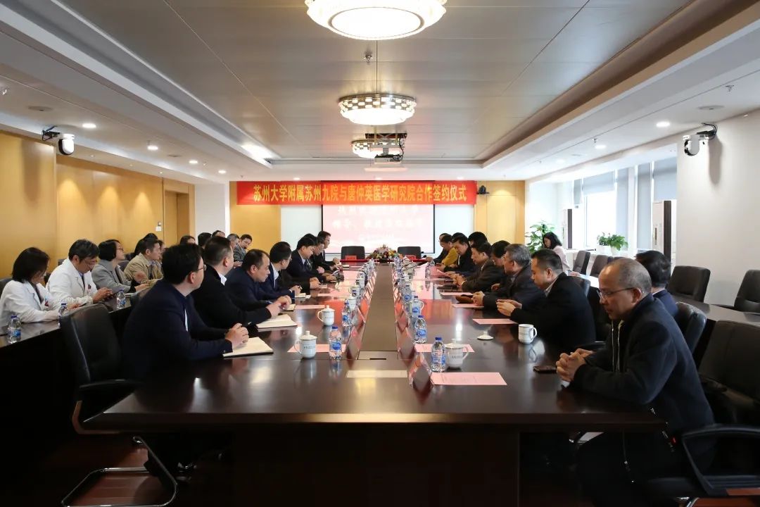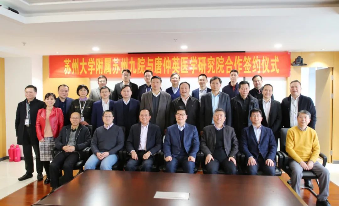 3月23日下午,苏州大学唐仲英医学研究院与苏州大学附属苏州九院科技帮扶签约活动在苏州九院行政综合楼9楼3号会议室举行。苏州大学唐仲英医学研究院副院长(主持工作)戴克胜、唐仲英血液学研究中心副主任朱力、唐仲英医学研究院黄玉辉、周泉生、杨林、王建荣、赵昀等7位教授以及苏州大学医院管理处处长、医学部副主任徐小乐、唐仲英医学研究院党委书记芮秀文等相关领导出席参加。本次活动是在苏州大学医院管理处主导下推行的,旨在推进非直属附属医院医教协同发展、提高临床科研水平。自2020年底起,医院管理处积极推行“一院一所”(一个校内科研院所/学院对接一家非直属附属医院)精准科技帮扶战略。