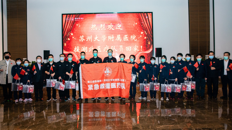 在苏州大学附属医院派出的八批共计204名驰援湖北的医疗队员中,第三批支援武汉同济医院光谷院区的89人“大部队”人数最多。他们按照国家统一安排于3月31日从湖北撤离返回苏州,经过14天的休养,将陆续回家与亲友团聚。4月14日晚,我校举行附属医院援湖北医疗队员回家欢迎仪式,苏大附一院和苏大附二院共32名医疗队员参加。
