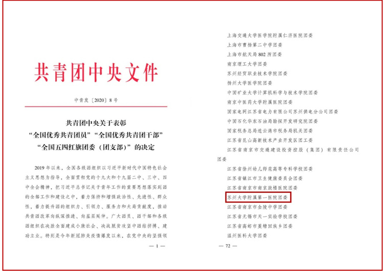 在“五四”运动101周年到来之际,从团中央传来喜讯,苏州大学附属第一医院团委荣获2019年度“全国五四红旗团委”。“全国五四红旗团委”是共青团中央授予全国基层团组织的最高荣誉。这是院团委近年来继荣获苏州大学“五四红旗团委”、苏州市“五四红旗团委”、江苏省“五四红旗团委”等荣誉称号后,再次获得综合性荣誉。这是在医院党政和各级团组织领导和指导下的结果,是附一院院团委几代人付出的结果,是全院青年奋勇争先的结果,标志着医院团青工作跃上了新台阶。