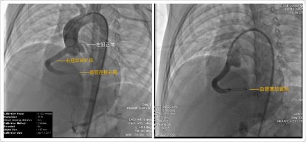 冠状动脉瘘是一种罕见的心血管发育畸形,人群患病率万分之二,在所有心血管检查患者中,阳性率也仅占0.1%-0.2%,本病可为呼吸困难、反复感染、心肌梗塞的原因,漏诊率高,且远期预后差。该患儿进行PDA随访时,彩超检查发现冠脉发育异常,可见右侧冠状动脉侧枝畸形,最宽处达5.6mm,畸形血管远端经瘘管汇入右心室(术中造影影像)。虽目前无特殊症状,但如不治疗,将逐渐出现心肌缺血、心肌梗死、心脏衰竭等病症。