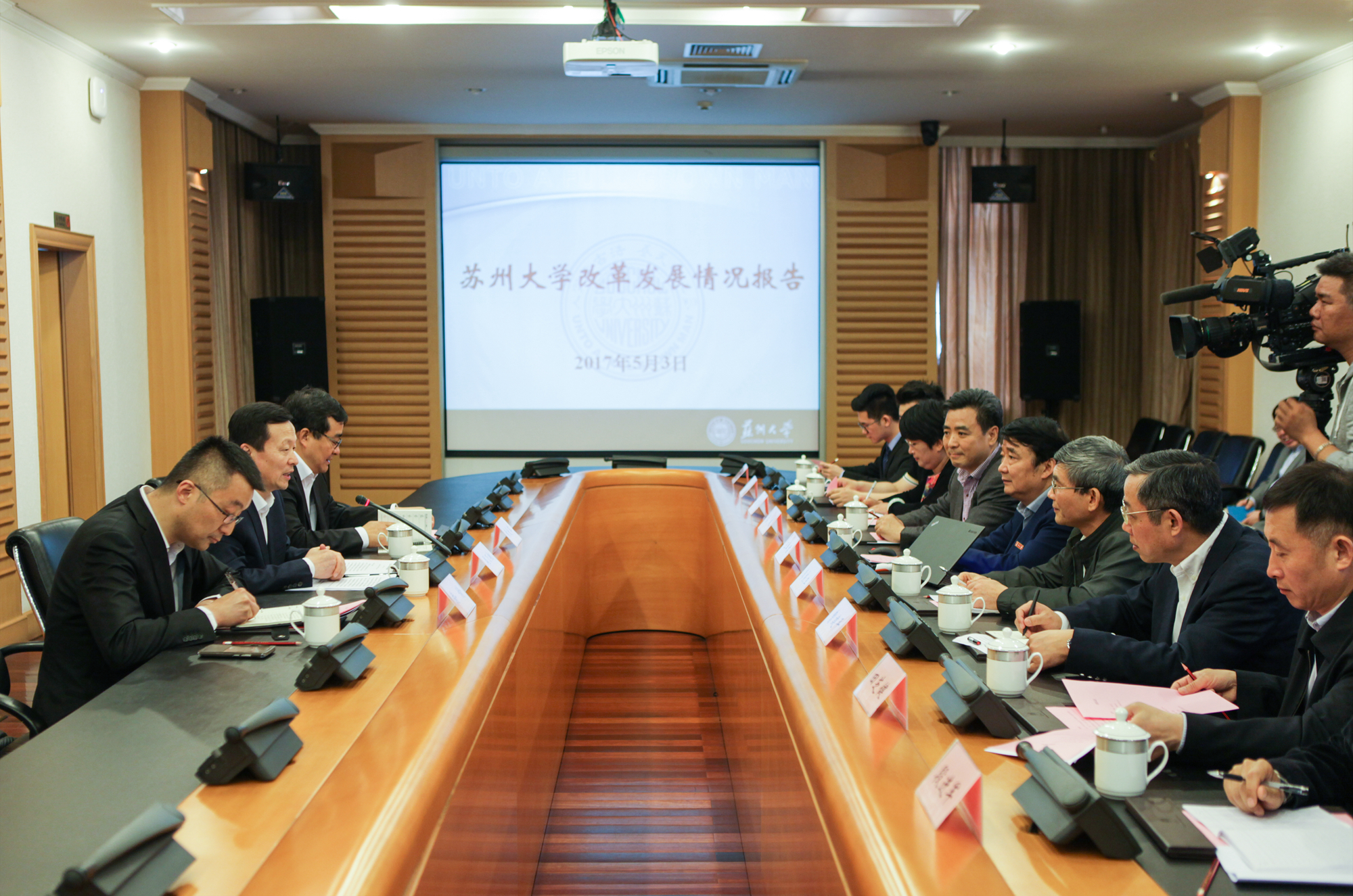 校党委书记王卓君代表我校全体师生员工对周乃翔书记一行的到来表示热烈欢迎,并简要介绍了我校的发展现状以及未来愿景。他指出,苏州大学的快速发展也得益于苏州深厚的历史文化的滋养和苏州市委、市政府的关心与支持。随后,他围绕“名城名校融合发展”战略的实施情况、师生思想政治工作的开展情况等方面做了详实的汇报。王卓君表示,希望苏州市委、市政府继续关心支持苏州大学的改革发展,今后我校将继续秉持负重奋进的精神,努力开拓独特的发展道路,争取有更好的发展,为苏州高水平全面建成小康、率先实现基本现代化做出苏州大学应有的贡献。