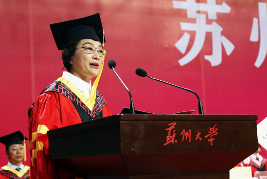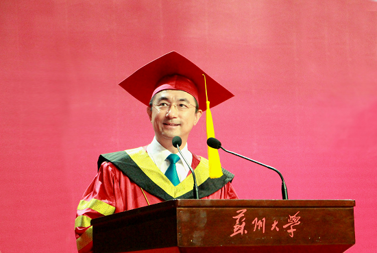 校学位评定委员会主席、校长熊思东向8658名毕业生致以最热烈的祝贺。熊思东校长在致辞中与毕业生们一起深情回顾了大学四年学习生活的点点滴滴,分享了9位毕业生的大学成长故事。9位大学生或是敢于追梦的学子,或是科研学霸,有的在国际舞台崭露头角为国争光,还有的热心公益前往在山区支医支教、奔赴沙漠治沙。在致辞中,他用今年毕业生抽样调查数据分析与去年做了对比,解析了2017届的“成长密码”。熊思东校长祝贺每一位同学在苏大实现了华丽的转身,创造了属于自己的“王者荣耀”。
