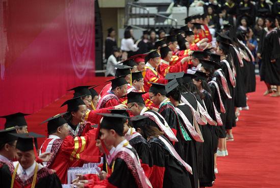 现场,毕业生身着庄严的学位服,30人一组陆续登台,主礼教授依次为学位获得者授予学位证书、扶正流苏,并合影留念。优秀毕业生们佩戴着学校精心准备的优秀毕业生荣誉绶带,率先登台接受学位授予。