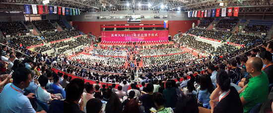 6月28日,苏州大学2017年学位授予仪式在独墅湖体育中心隆重举行。校领导熊思东、袁银男、路建美、江作军、蒋星红、陈卫昌,校学位评定委员会成员,2017年获博、硕、学士学位毕业生,毕业生家属、亲友代表,毕业生曾经就读中学的校长代表、部分校董和校友代表,我校各学位评定分委员会成员、研究生导师、学校相关职能部门的负责人、各学院(部)的领导、教师和辅导员代表,后勤工作人员代表等近万人共同参加了学位授予仪式。仪式由校党委副书记、副校长江作军主持。