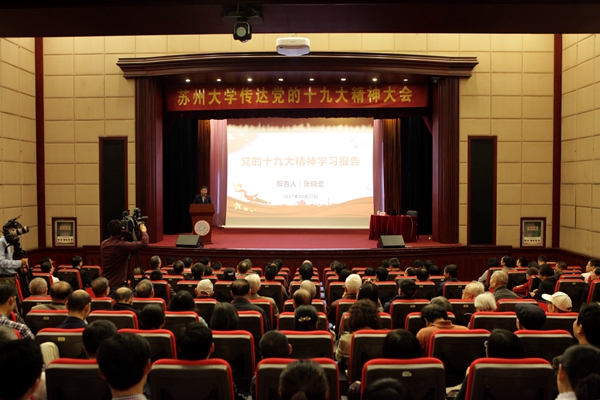 江涌书记指出,党的十九大是划时代的、具有里程碑意义的大会,对下一步党和人民的事业,对于苏州大学未来发展具有重要的指导意义。全校师生要深刻理解、准确把握党的十九大精神,深刻领会并把握新的历史方位、新的指导思想、新的社会主要矛盾、新的奋斗目标,深入学习贯彻习近平新时代中国特色社会主义思想的深刻内涵、精神实质与历史地位。学校对学习宣传贯彻党的十九大精神相关工作非常重视,制定了详细的学习宣传贯彻党的十九大精神的工作计划,起草相关文件,组建十九大精神宣讲团,认真进行课题研究,开展习近平新时代中国特色社会主义思想三进工作。他强调,要把学习宣传贯彻党的十九大精神和“两学一做”学习教育常态化制度化相结合,抓紧落实校第十二次党代会精神和实现我校“十三五”规划确定的奋斗目标相结合,与学校各学院(部)、各部门以及各单位的工作实际相结合,全校师生要紧密团结在以习近平同志为核心的党中央周围,在思想上、政治上、行动上与党中央保持高度一致,增强“四个意识”,努力争创国内一流、国际知名高水平研究型大学。