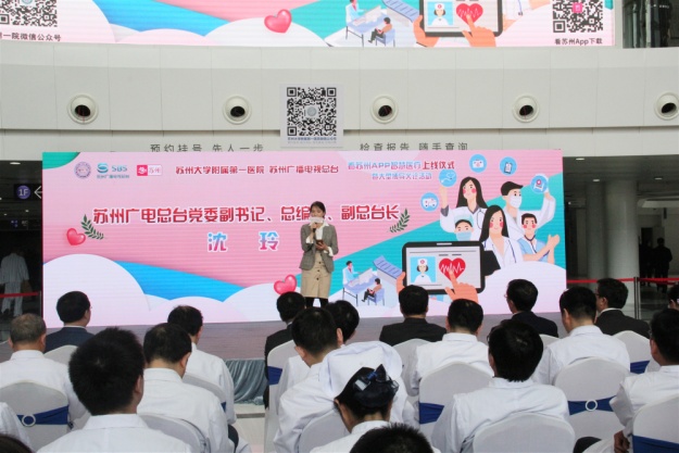 接着,苏州广电总台党委副书记、总编辑、副总台长沈玲上台发言,她详细介绍了智慧医疗平台的功能以及服务模式。她表示,这是一次有意义的跨界创新合作,整合了双方的优质资源,开发出了这一款智慧医疗平台。在给市民提供全方位的科普资讯的同时,也给医生提供了良好的展示平台。通过智慧医疗的上线,通过市民线上的体验,智慧医疗平台将更好地满足市民对健康医疗的需求。未来,广电总台和苏大附一院联合开发的其他功能也将陆续上线。