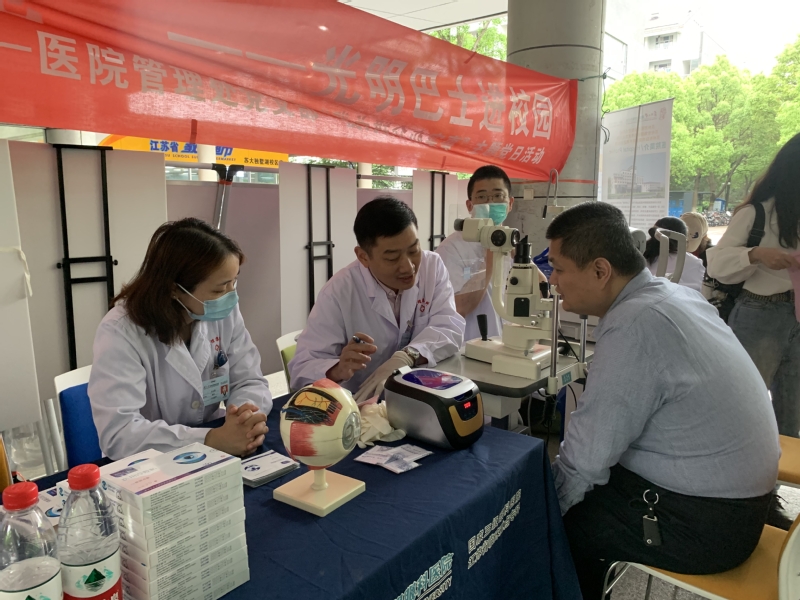 此次党日活动共分为两场,5月13日在独墅湖校区一期食堂楼下、5月14日在天赐庄校区图书馆一楼大厅。专业的眼科医生走进校园,现场为师生提供免费电脑验光、裂隙灯检查、检眼镜检查等,并提供眼病义诊、咨询服务。医生们耐心细致地为大家讲解眼健康科普知识,对日常眼科的常见病、多发病的预防和常用眼科药品等方面进行指导,之后还为大家发放宣传折页等形式宣传珍爱眼睛、定期眼检查的重要性,受到了在场师生们的热烈欢迎。大家踊跃参与、积极咨询,两场活动共吸引了近400人次前来,现场气氛热烈。