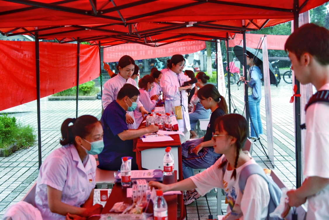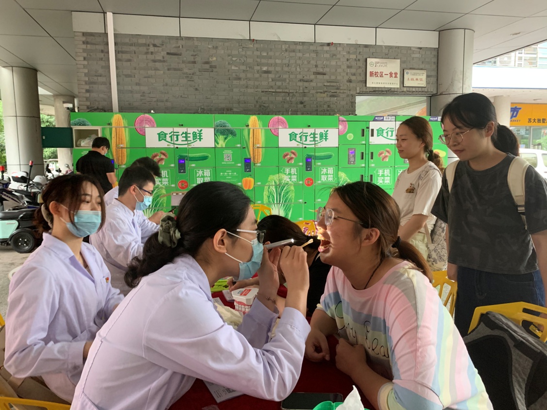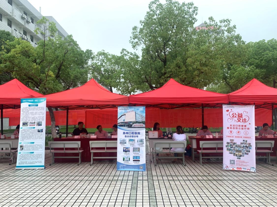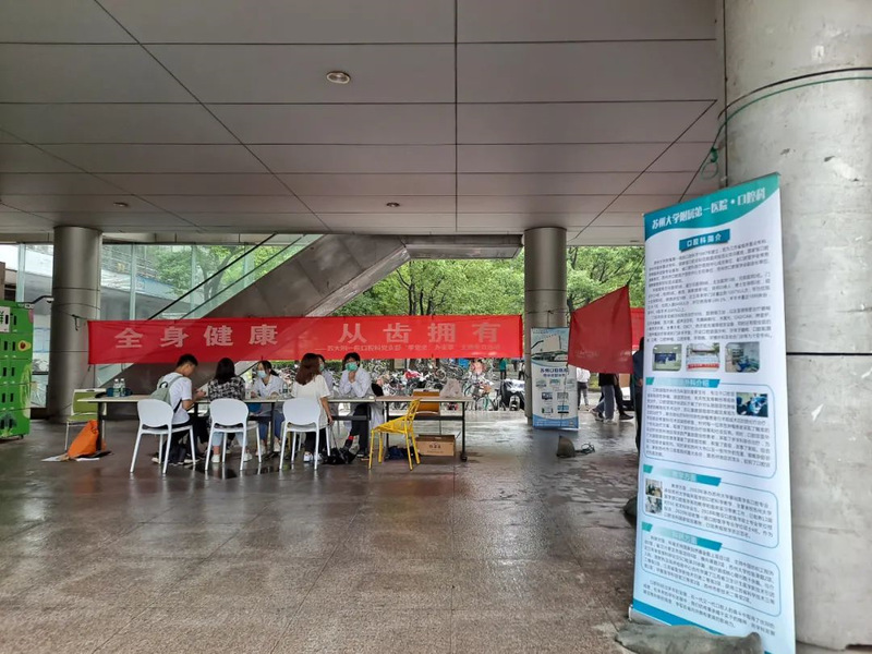 此次口腔义诊主题党日活动也分为两场,6月17日在独墅湖校区一期食堂楼下、6月18日在天赐庄校区东区教育超市门口广场。专业的口腔医生们不畏风雨,走进校园现场为师生们提供免费血压测量、口腔筛查,并作口腔疾病义诊、咨询及治疗方案设计。