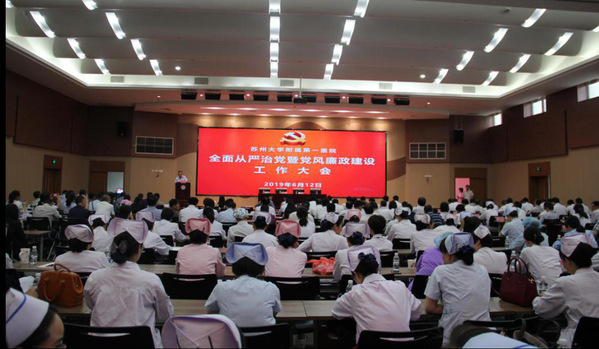 为深入贯彻落实党的十九大、十九届中央纪委三次全会精神以及习近平总书记系列重要讲话精神,深化落实“两个责任”,推进全面从严治党,6月12日下午,2019年度苏州大学附属第一医院全面从严治党暨党风廉政建设工作大会在总院学术报告厅召开。全体院领导、院党政职能科室负责人、总支书记、纪委委员、临床医技科室主任、护士长以及涉及医院设备、耗材、药品、工程、物业、安保等服务供应商代表等出席了此次会议。会议由党委副书记、纪委书记丁春忠主持。