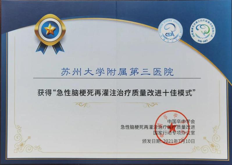 7月8-11日,中国卒中学会第七届学术会议暨2021天坛国际脑血管病大会在北京国家会议中心举行,苏州大学附属第三医院(常州一院)卒中中心申报的项目模式《打造并完善城市卒中急救体系--急性脑梗死再灌注治疗模式改进》喜获“全国急性脑梗死再灌注治疗十佳改进模式”荣誉。