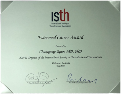 2019年7月6-10号,国际血栓与止血学会(the International Society on Thrombosis and Haemostasis,ISTH)第二十七届大会在澳大利亚墨尔本会展中心召开。在7月6号的大会开幕式上,我校阮长耿院士获得国际血栓与止血学会主席Claire McLintock颁发的终身成就奖(ISTH Esteemed Career Awards),表彰其对血栓与止血领域做出的杰出贡献,阮长耿院士是获得国际血栓与止血学会奖的第一位中国学者。